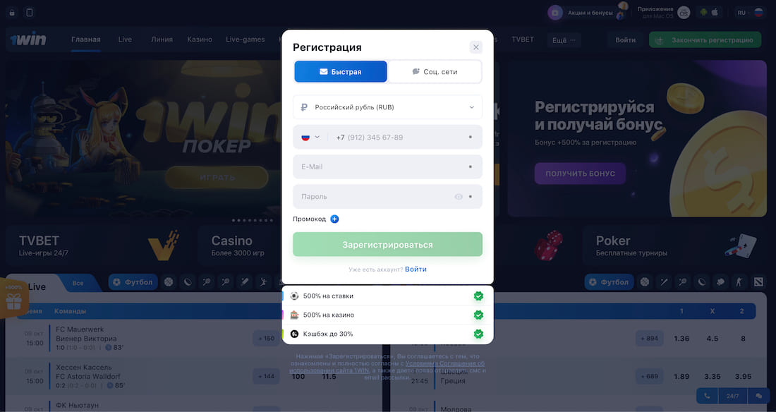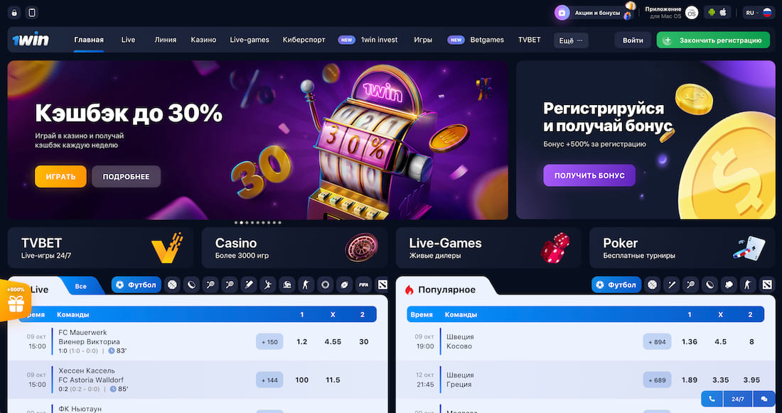Интернет-площадка 1 Win объединяет букмекерскую контору и казино, предоставляя пользователям возможность играть на деньги в игровые автоматы и заключать пари на спортивные события. Для начала требуется пройти регистрацию на официальном сайте или в приложении.