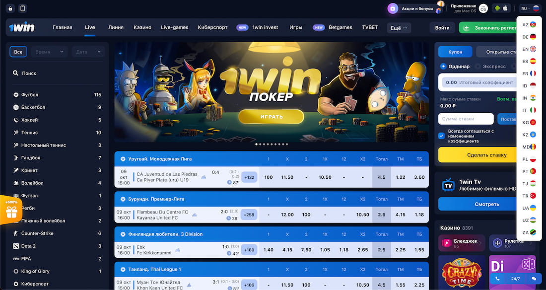 Международный оператор 1 Вин, работающий на рынке с 2016 года, имеет лицензию Кюрасао. Официальный сайт переведен на более чем 20 языков, включая английский, русский, испанский, португальский, хинди и бенгальский. Платформа предлагает делать ставки на спорт как в прематче, так и в лайве.